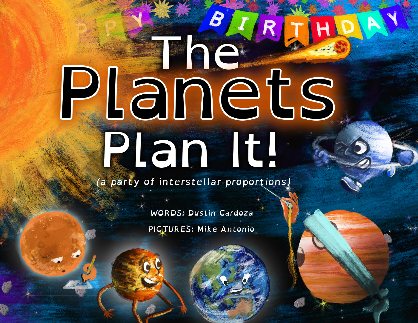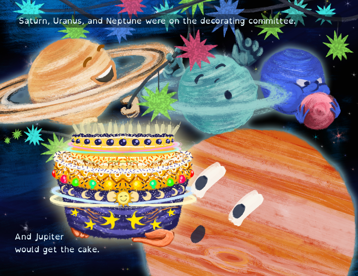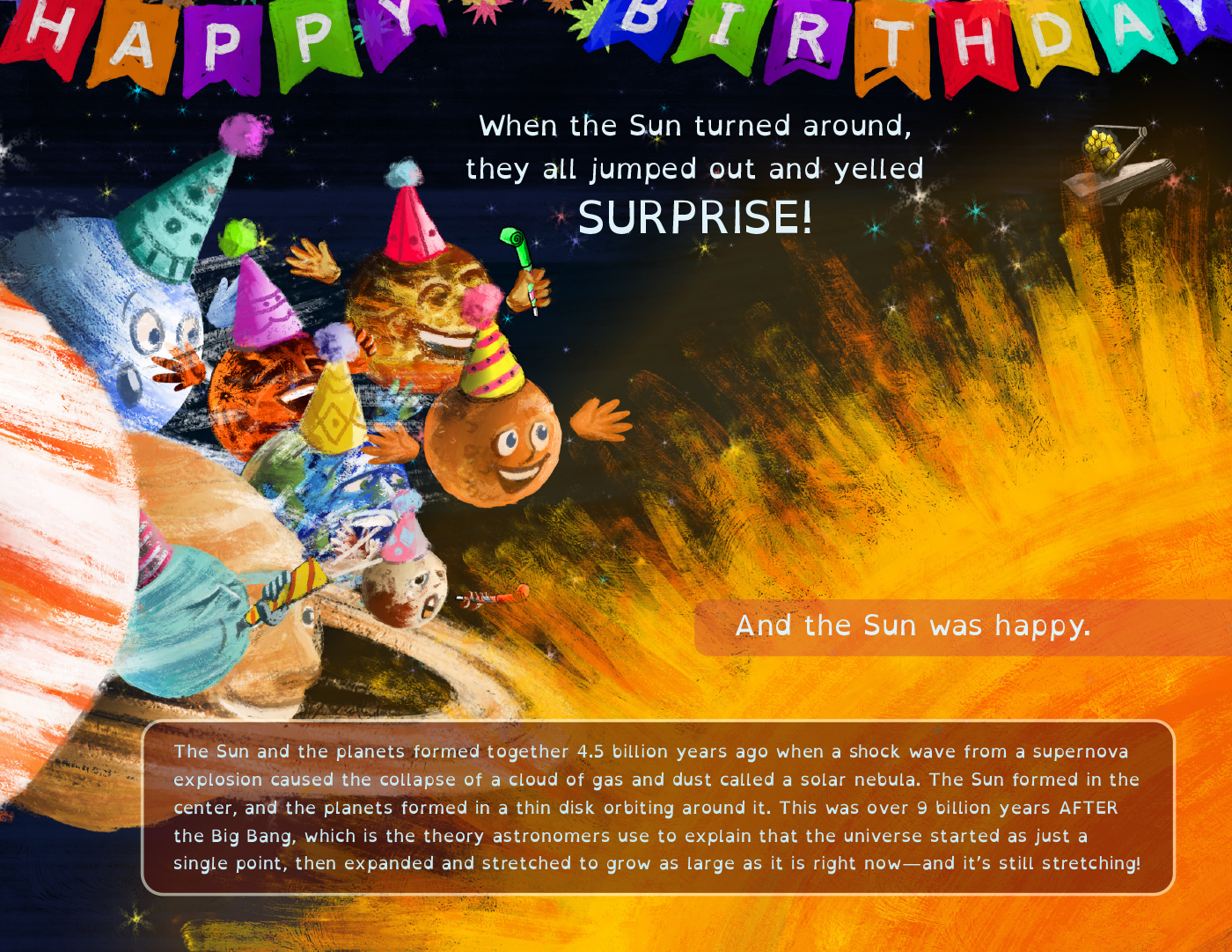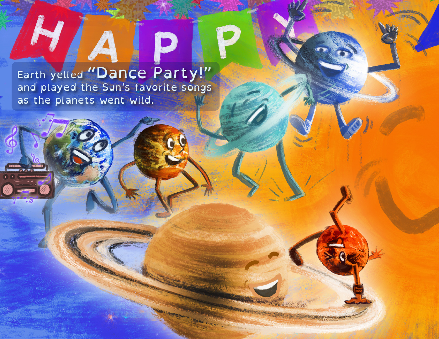 In the vast cosmic playground, where planets twirl and stars wink, a celestial celebration is brewing. The Sun, that radiant ball of cosmic fire, is about to mark a stellar birthday milestone but there are no other stars nearby to celebrate with. And that makes the Sun gloomy. The planets, who don’t usually get along, have to work together to cheer up their dear friend by throwing a surprise party of interstellar proportions! And there’s also the Pluto situation…